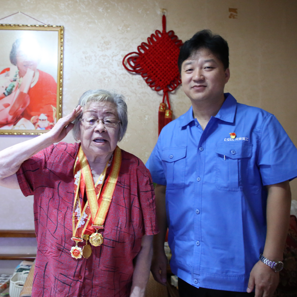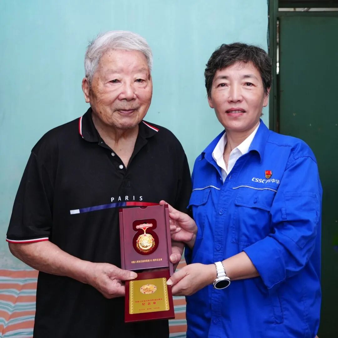 在紀念中國人民抗日戰爭暨世界反法西斯戰爭勝利80周年之際,中國船舶集團有限公司黨組副書記、董事賈海英走訪慰問抗戰老兵焦英杰,頒發“中國人民抗日戰爭勝利80周年”紀念章,并代表集團公司黨組向他致以崇高敬意和誠摯問候。