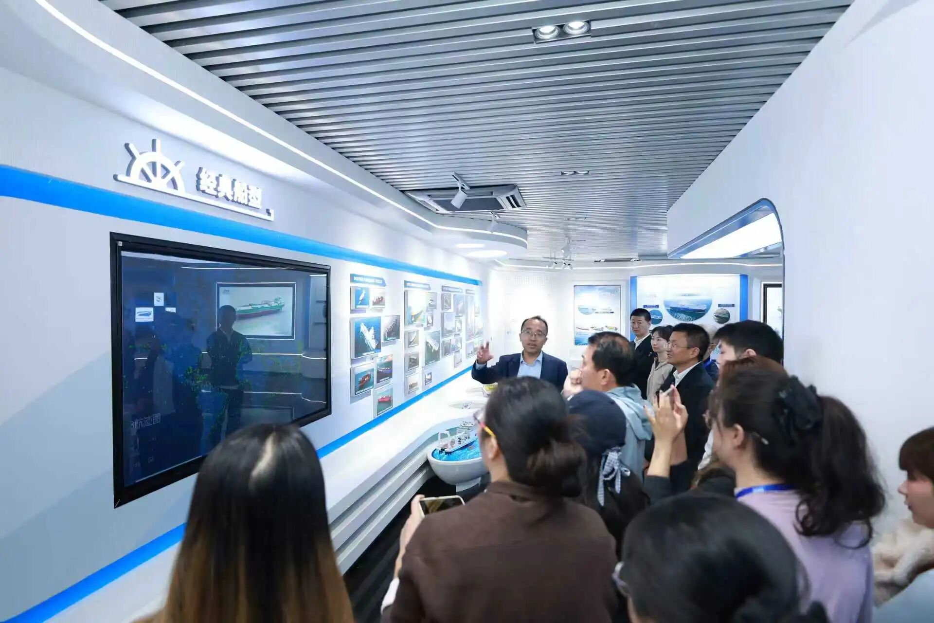 媒體代表團先后參觀了上船院展廳及智能船舶實驗室,并聽取了相關專家對院船型品牌與低碳零碳技術發展、數智賦能船舶研發設計等專題的講解,感受著上船院深厚的科技底蘊和創新的澎湃動力。