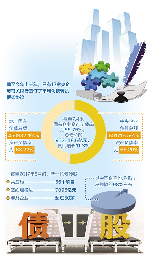 數(shù)據(jù)顯示,截至2017年6月初,我國新一輪債轉(zhuǎn)股共簽約56個項(xiàng)目,簽約規(guī)模達(dá)7095億元,涉及企業(yè)超過50家,其中以國企為主,簽約規(guī)模占總規(guī)模的98%左右。