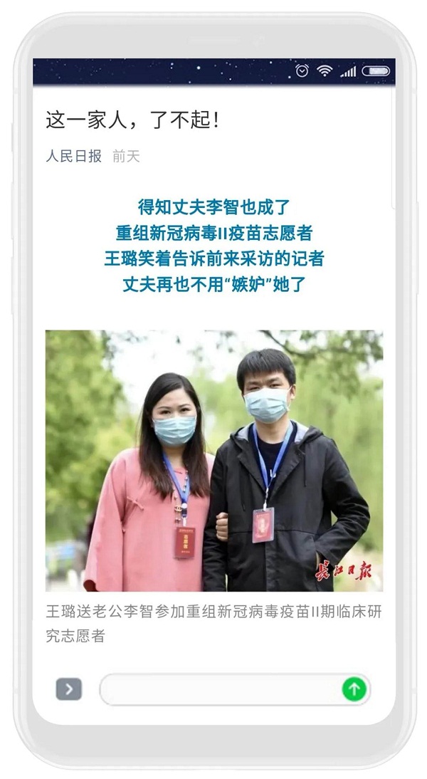 ????4月18日,人民日?qǐng)?bào)微信公眾號(hào)推送了這樣一條消息,詳細(xì)介紹了一位土生土長(zhǎng)的武漢人王璐及其家人自愿報(bào)名接種新冠疫苗的事跡,消息收獲了10萬(wàn)+的閱讀量與3.2萬(wàn)的“在看” ,還有動(dòng)輒幾千的留言點(diǎn)贊!這位女主角王璐來(lái)自中國(guó)船舶集團(tuán)七一七所,不同于第一批結(jié)束醫(yī)學(xué)觀察的志愿者,王璐所在組的年齡在20歲到50歲,是最早一批高劑量的接種者。