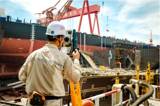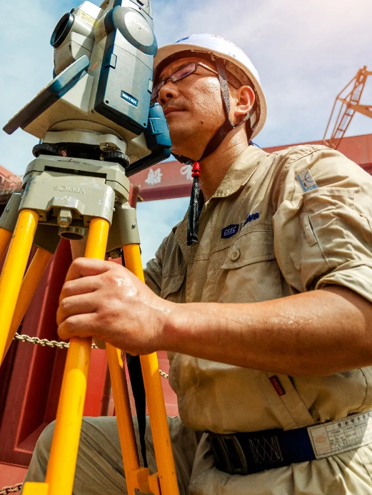 近40度的高溫天氣下,一位造船精度人堅守崗位,使用全站儀監控船塢每個搭載總段的定位精度,保障一次搭載到位。