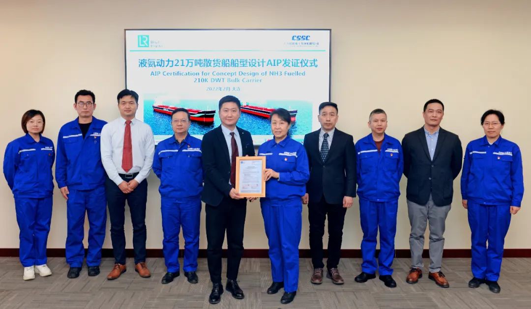 2月25日,中國船舶集團旗下大船集團最新研發的液氨動力21萬噸散貨船設計方案,獲英國勞氏船級社(LR)原則性認可(AIP)證書。