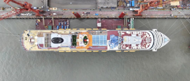 目前艙室、餐飲等區(qū)域的內(nèi)裝工程基本接近尾聲,乘客梯道、影院劇場、中庭廣場、水上樂園、高空繩索運(yùn)動項(xiàng)目等公共區(qū)域建成或基本建成,整體進(jìn)度達(dá)到95%。