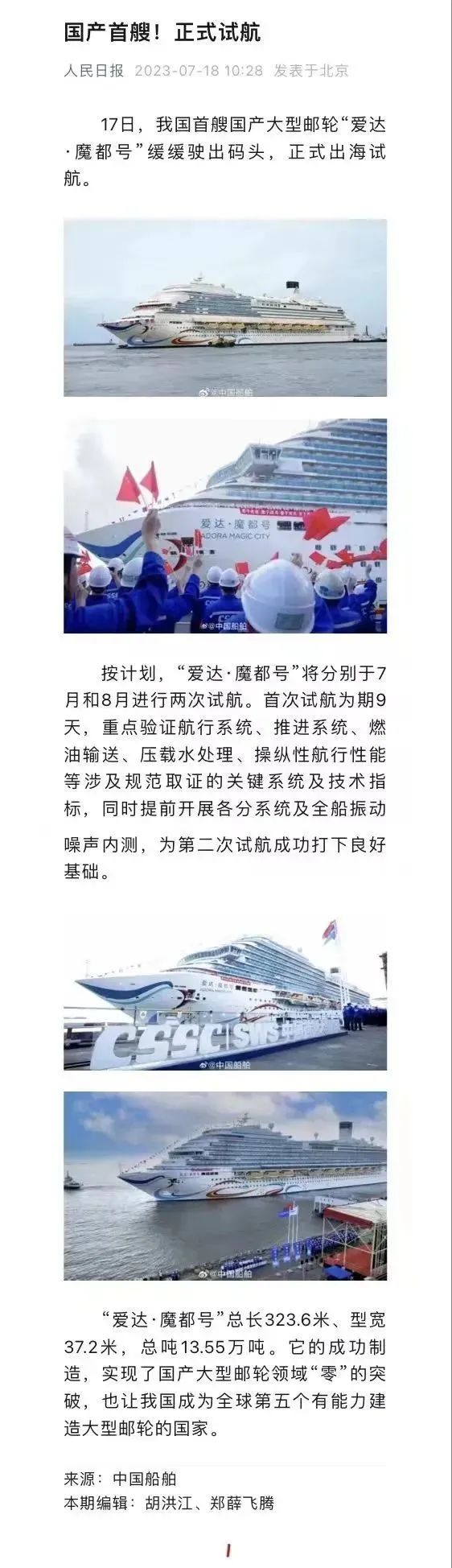 國(guó)產(chǎn)首制大型郵輪試航