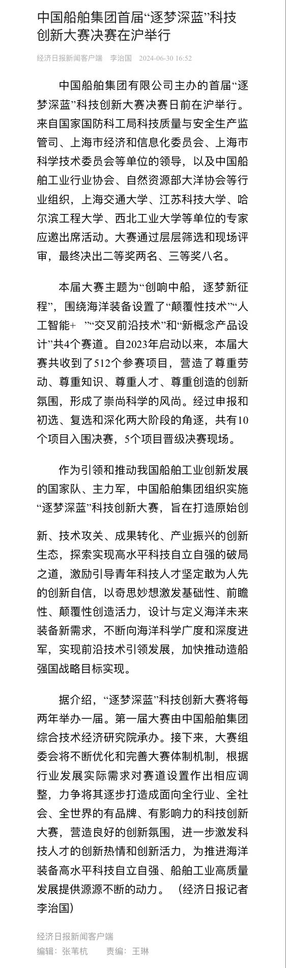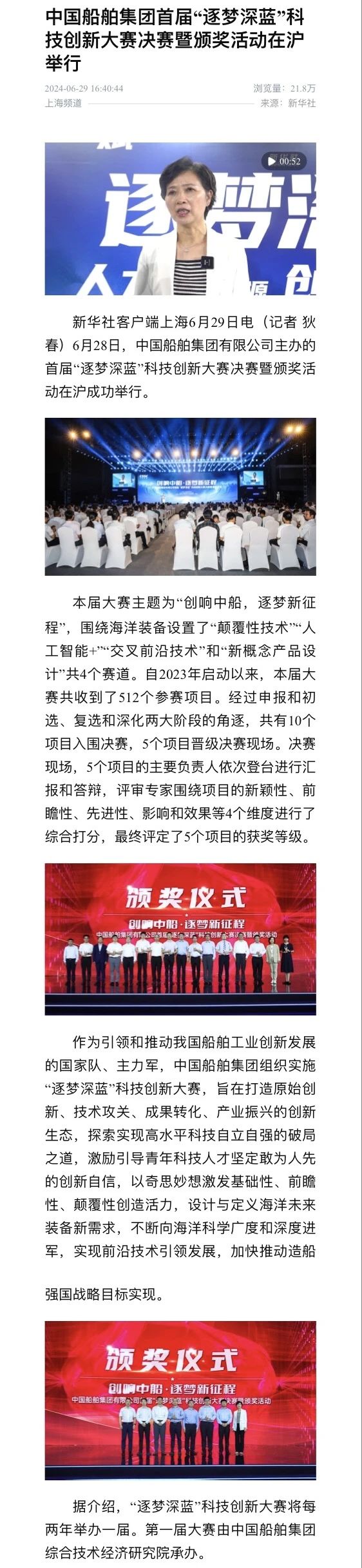 中國船舶集團有限公司主辦的首屆“逐夢深藍”科技創新大賽決賽暨頒獎活動引來各大媒體的關注,獲得高度評價。——>活動回顧